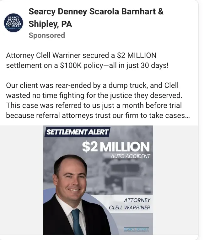 Even though all four Facebook Ads have their own strengths, if we had to pick one, it would be the last one—the ad telling Attorney Clell Warriner’s story.